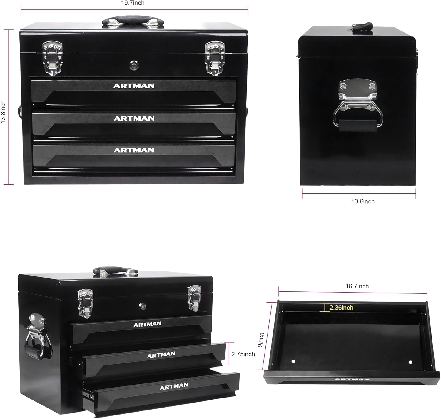 This is a sturdy toolbox. The 3-drawer toolbox is made of cold-rolled steel and coated with a powder-coated finish for enhanced durability, making it effectively waterproof and rust-resistant. It does not scratch, dent, or break easily. The surface of the toolbox is smooth and easy to maintain and clean. With 3 drawers and a top storage compartment, this tool chest offers ample space. Each drawer is equipped with smooth ball-bearing slides, ensuring easy and seamless opening and closing.